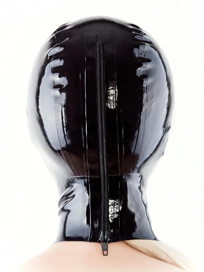 Latex mask with a cutout for mouth and nostrils and with a back zipper.