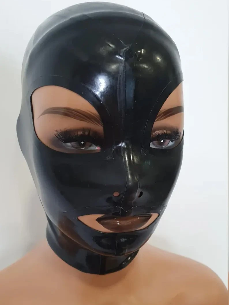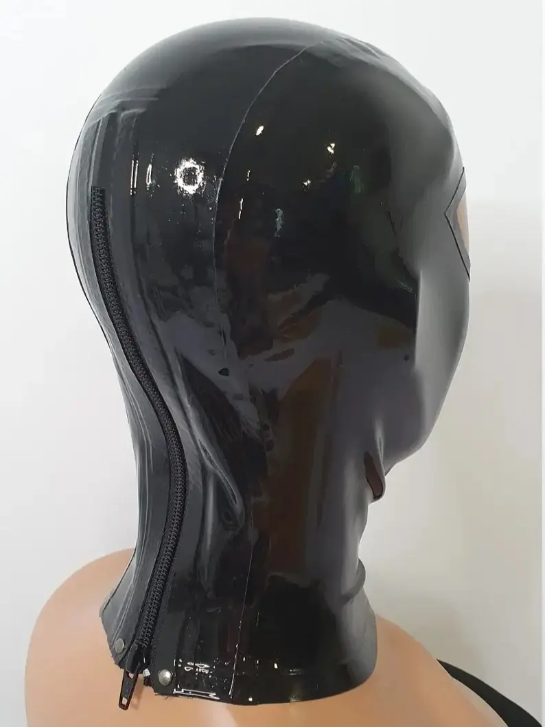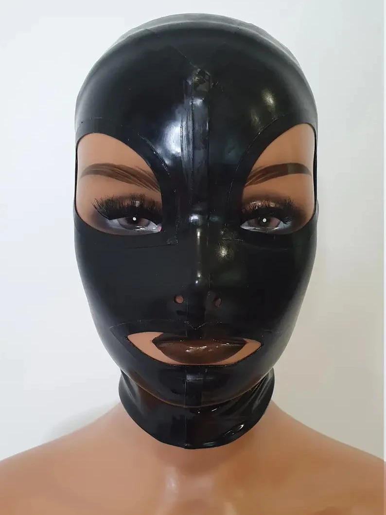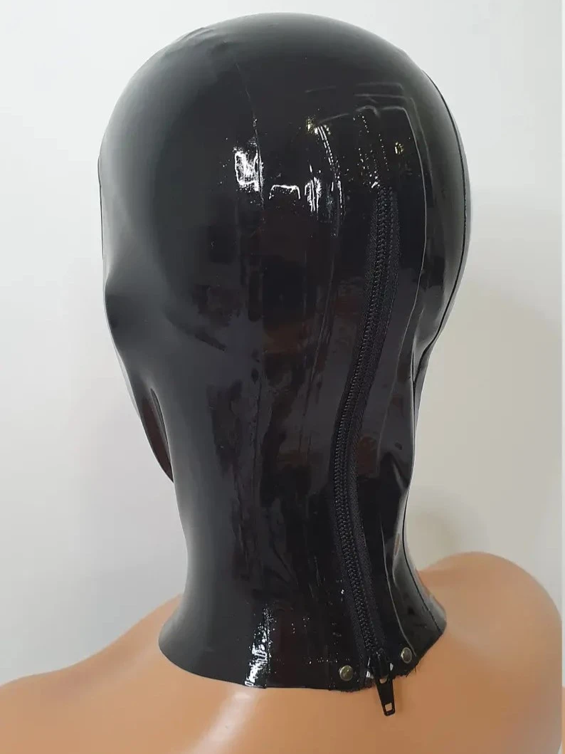 Eyes in the shape of tears, contrasting mouth, zip on the back, latex strip all along the zip to protect your hair!