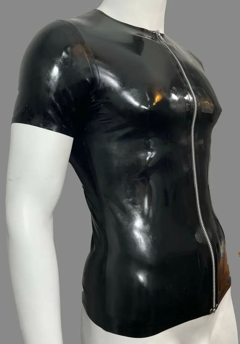 Rubber Latex Crew Neck Zip Front T-Shirt Short Sleeve .