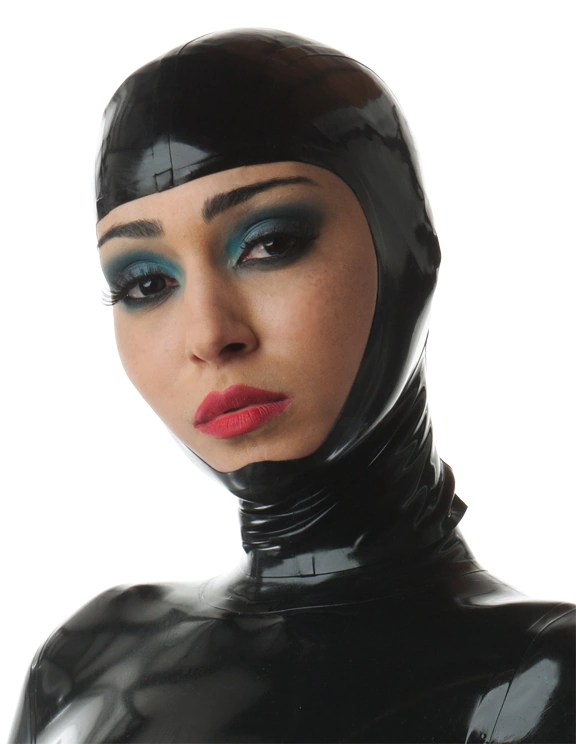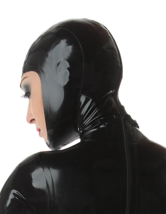 - latex open faced hood with chin, there is no zipper in this version.