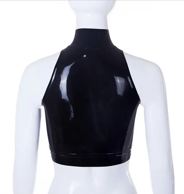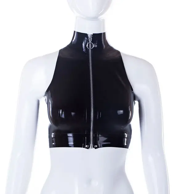 This crop top has a sleeveless design with hight collar, fits with a metallic zip with O ring zipper at the front. Shown in Black with silver zipper.