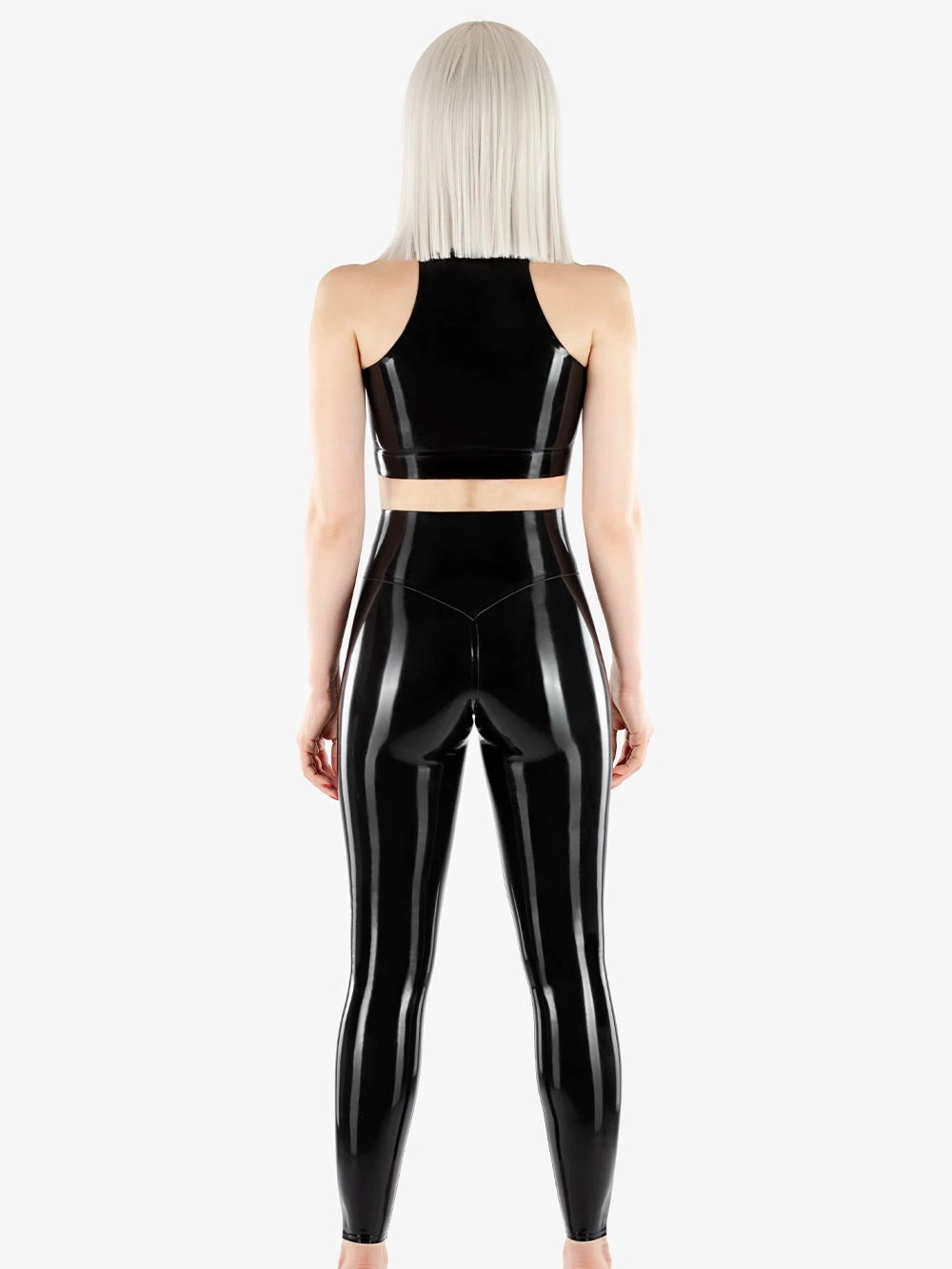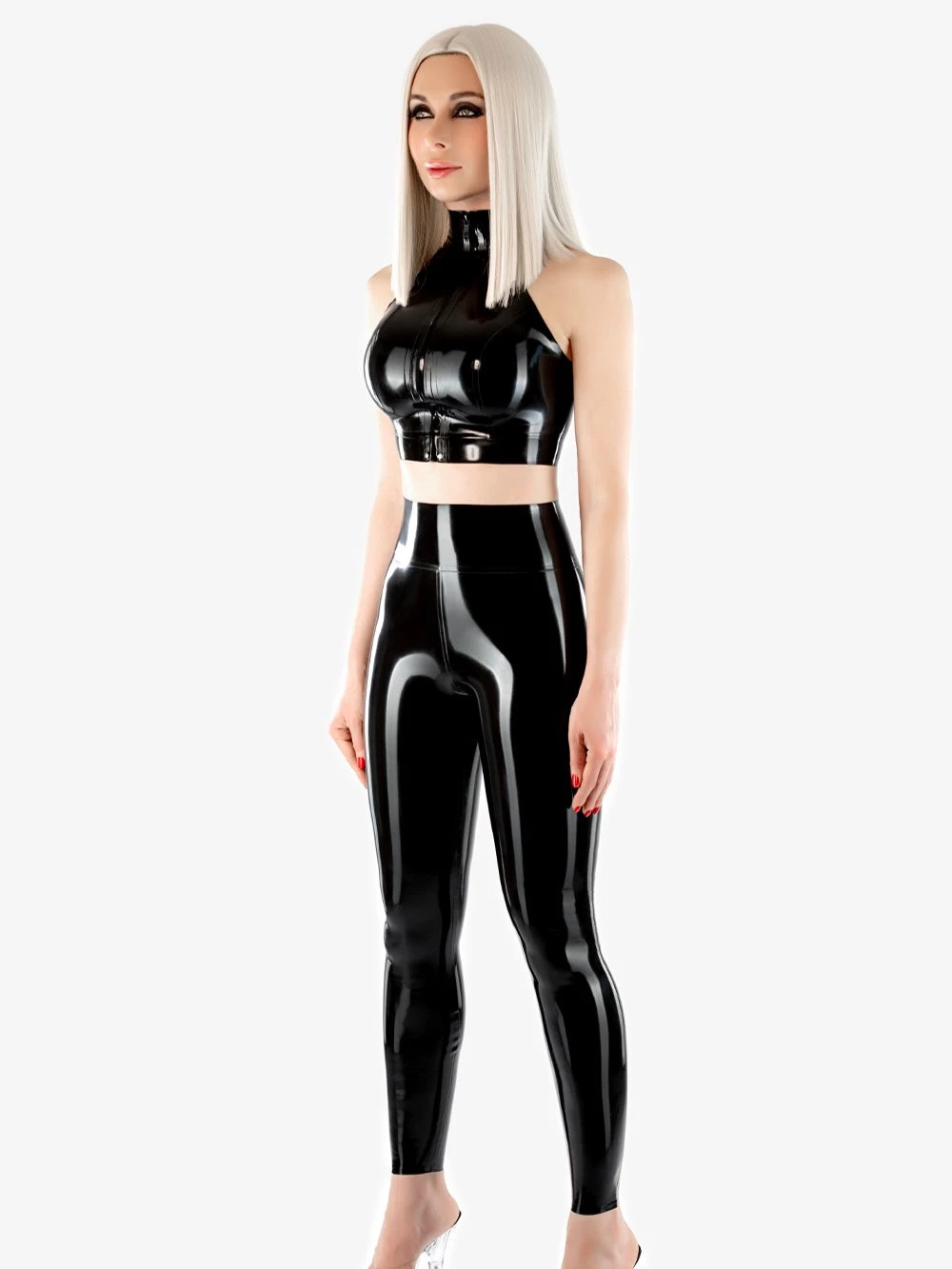 Sexy latex top with high collar and concealed zipper at the front, zipper can be fully opened. Top has anatomical seams for breasts, hand cutouts reinforced with latex trim.