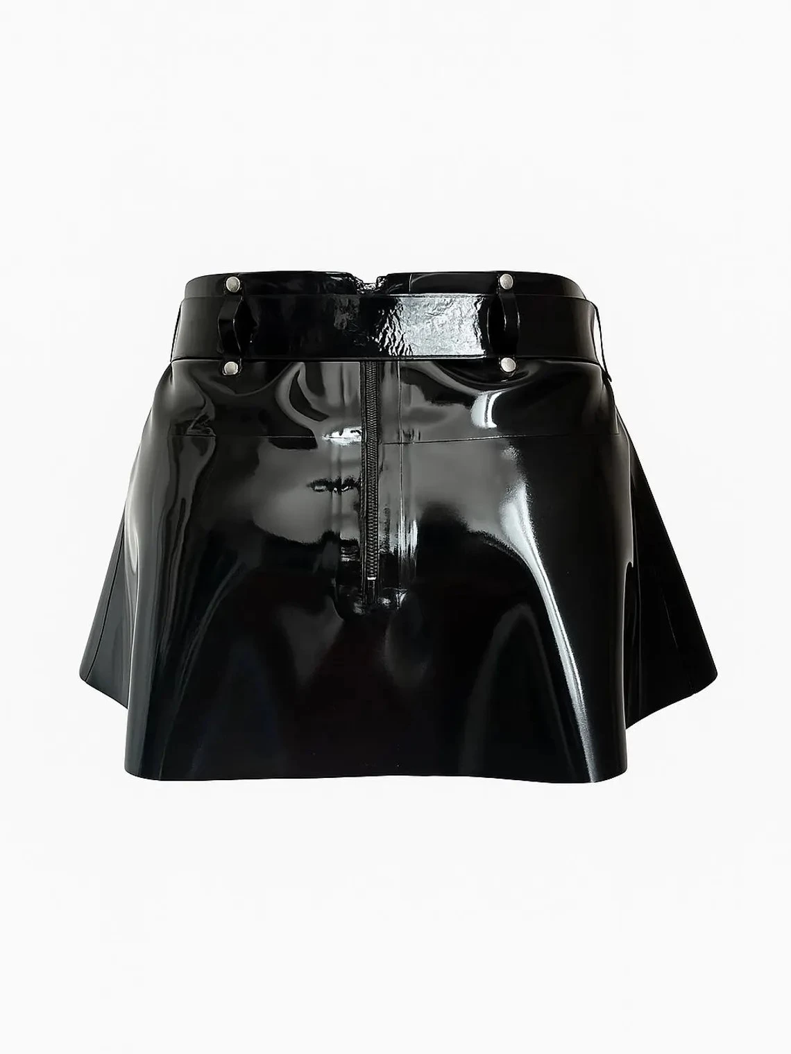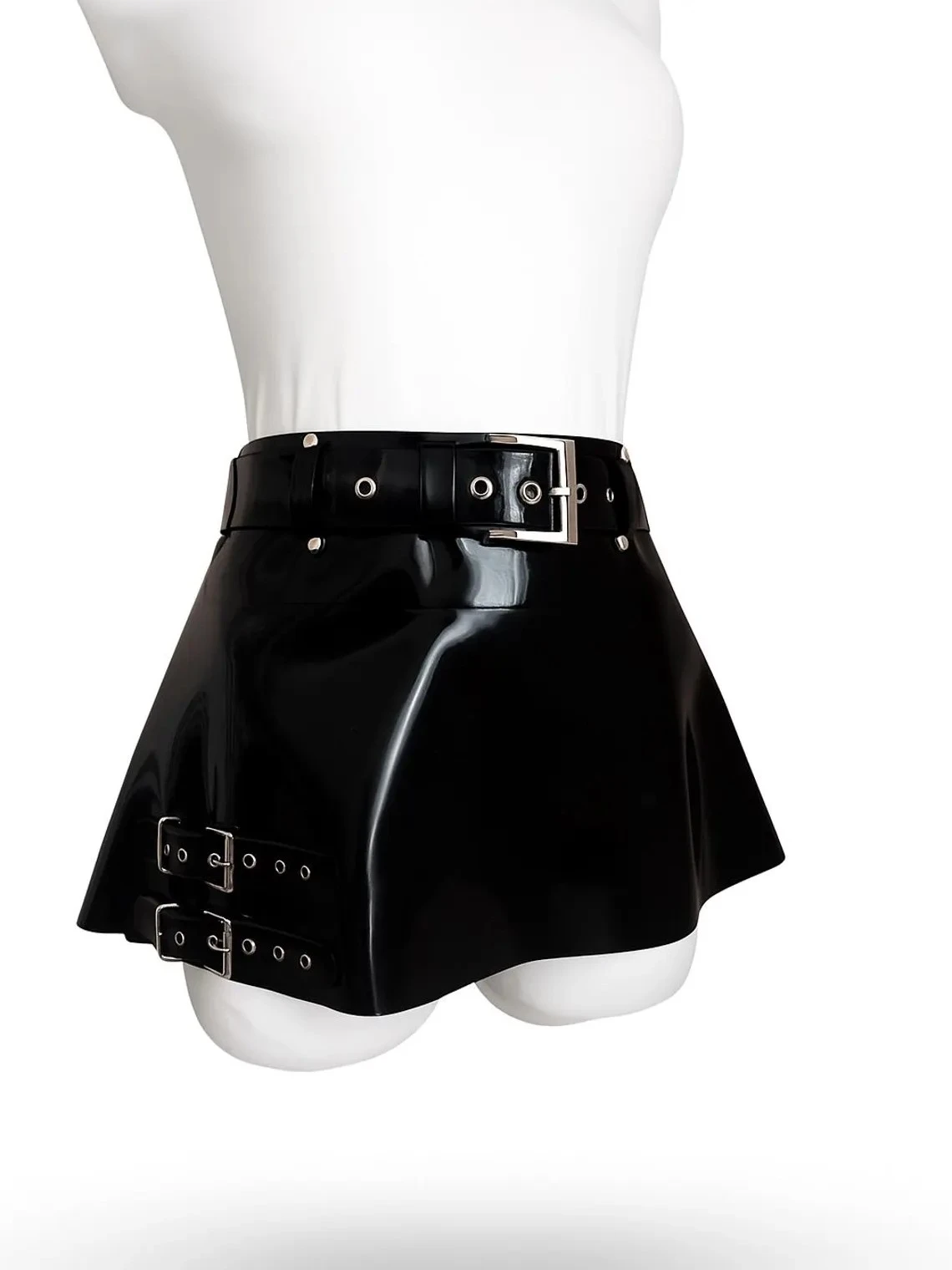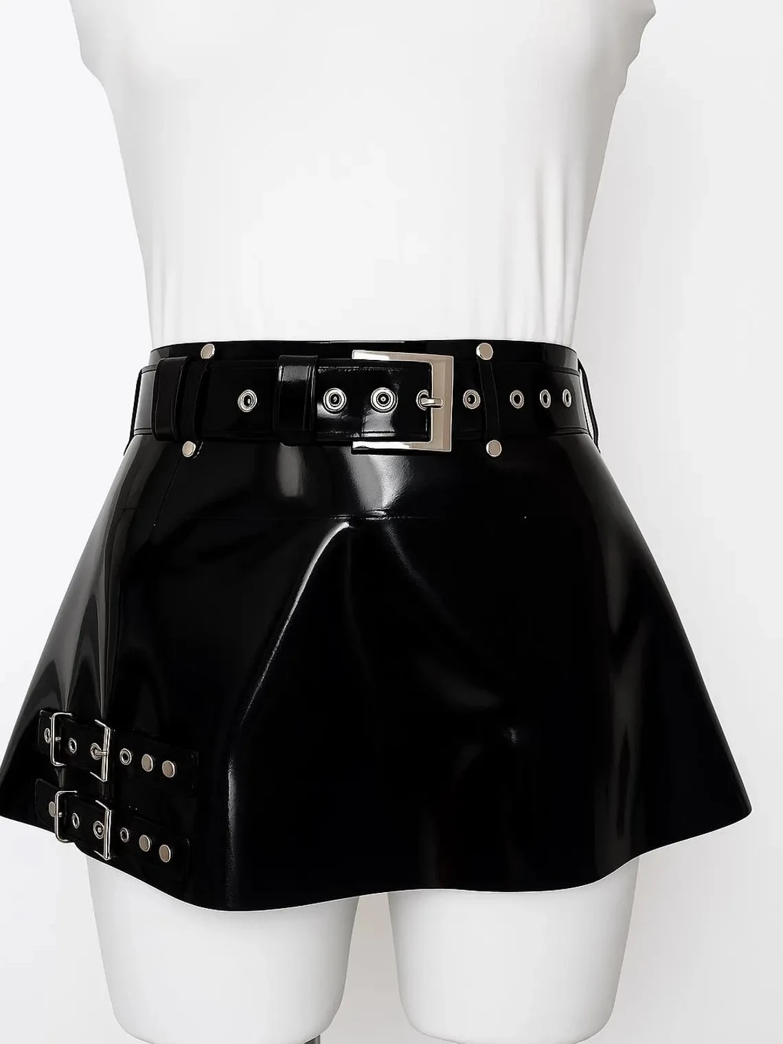 Latex A-Line Mini Skirt with Waist Belt & Dual Side Buckle Detail