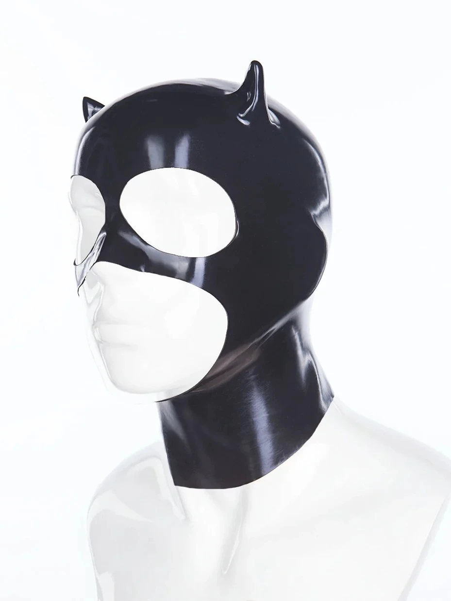 A sleek, form-fitting hood crafted from premium latex. The pointed ears echo the silhouette of classic superheroes, while the open eye and face cut enhances the gaze and adds a touch of mystery.