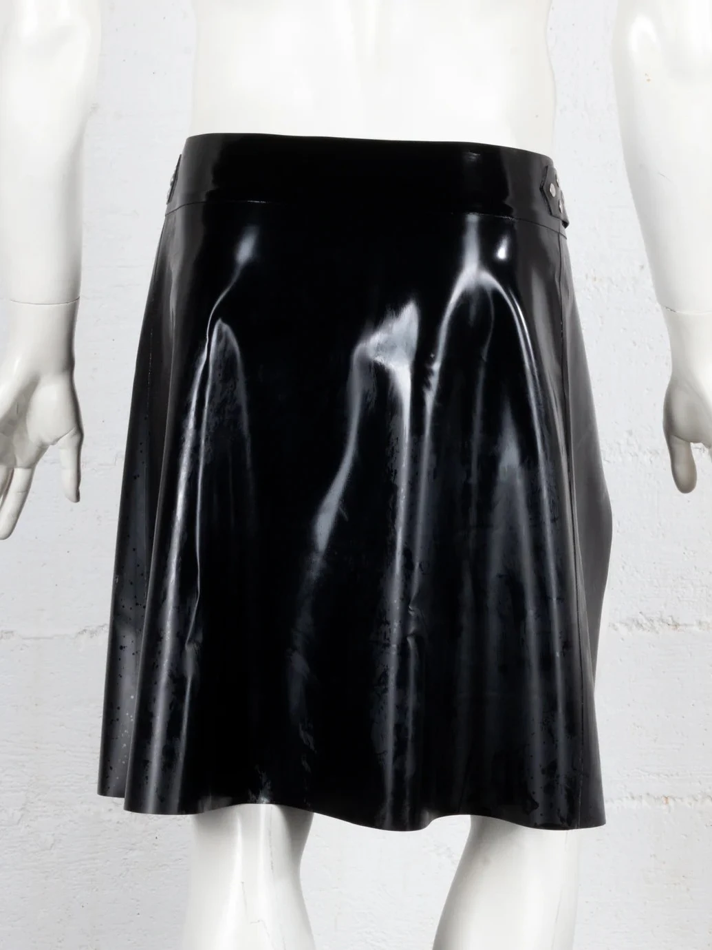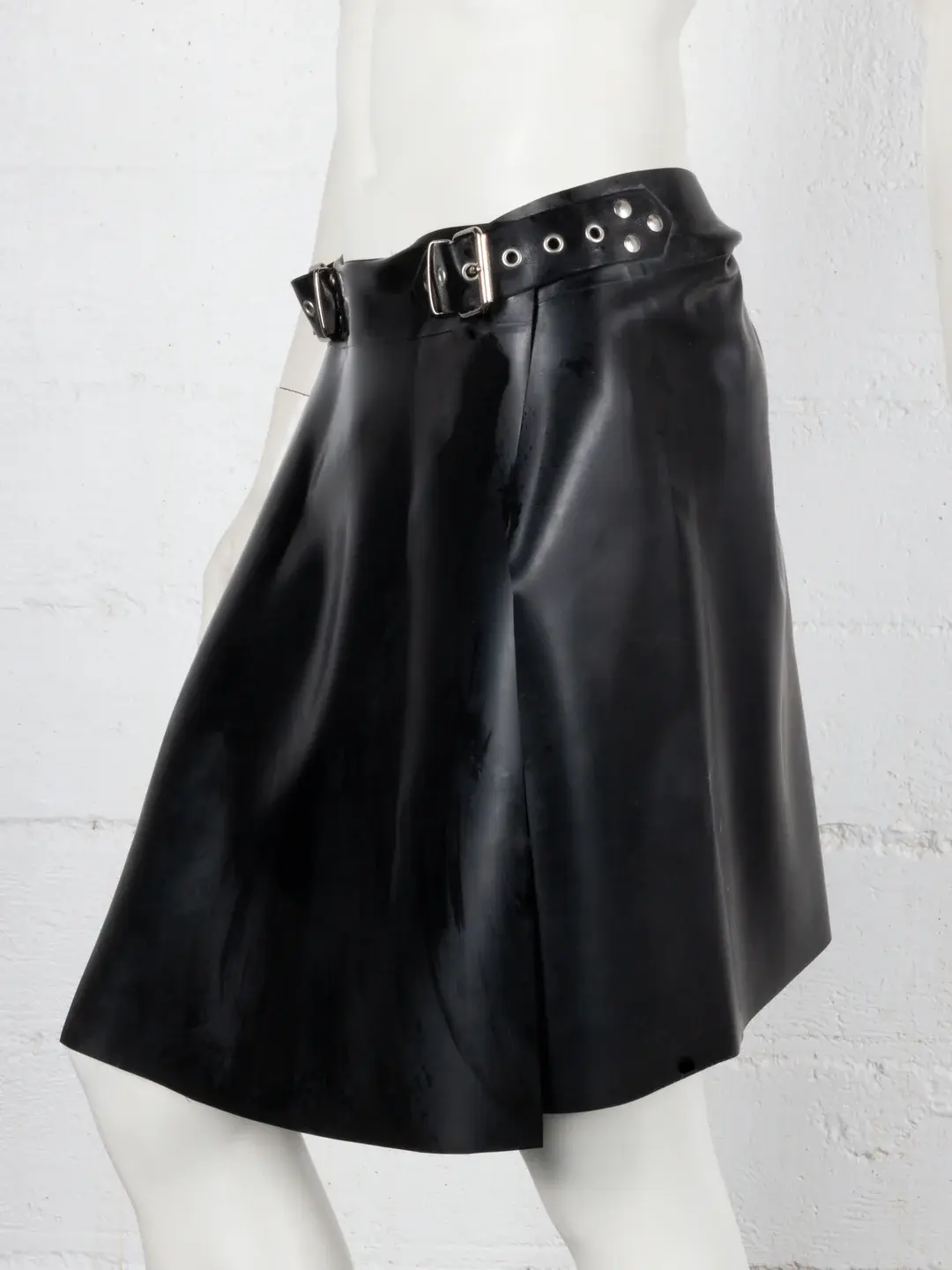 Front and back flaps make up this latex kilt, held together by the waistband. Buckle details on the left and right hip-fastening keep it in place.