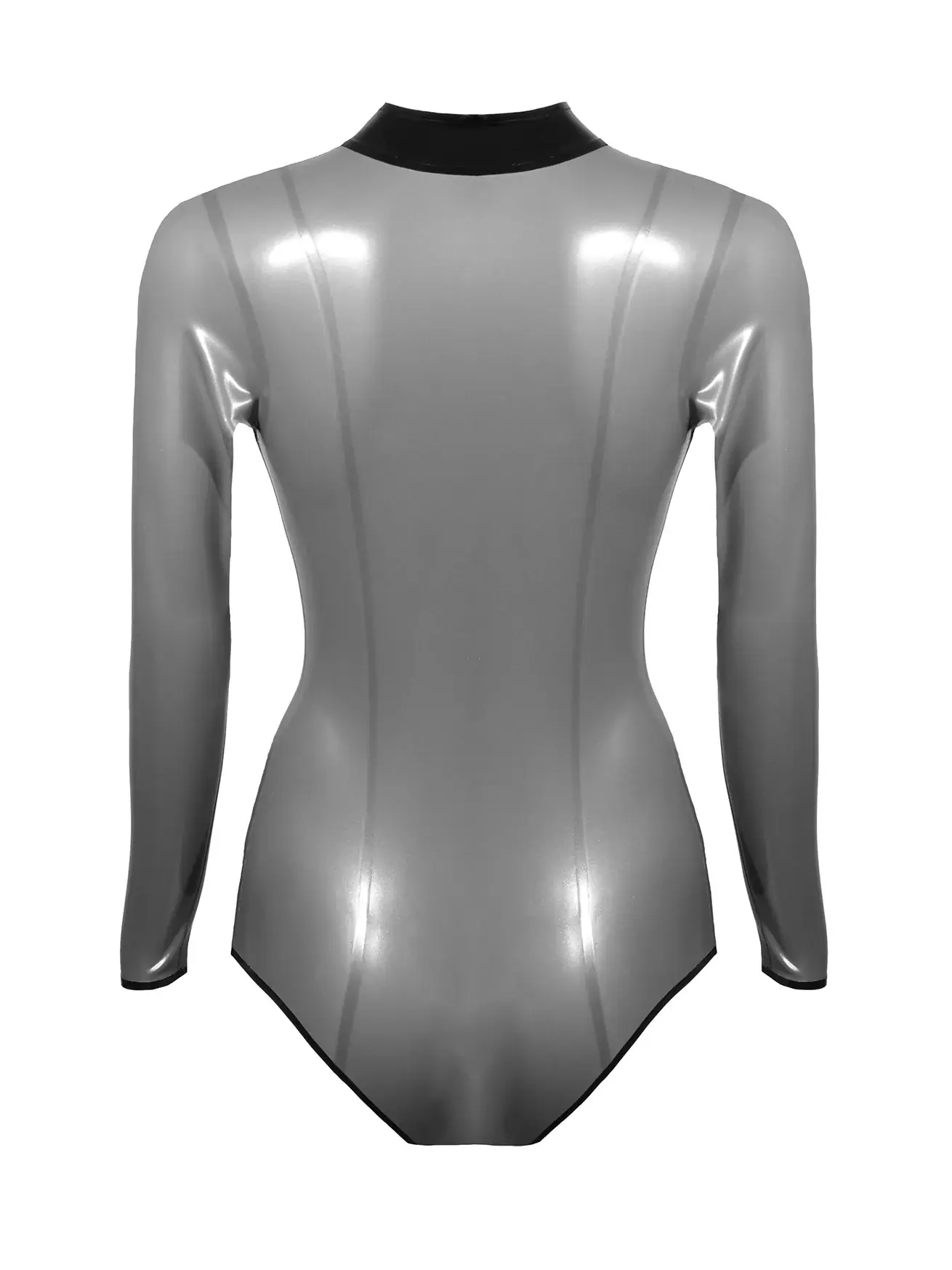 Long sleeve latex bodysuit, adorned with a charming collar featuring an adorable bow snap closure.
