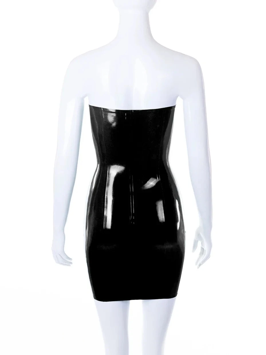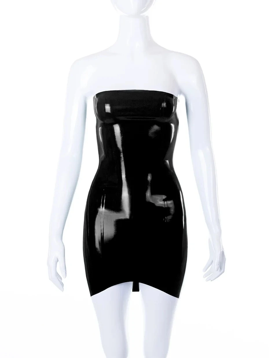 The Bridget tube dress is a strapless latex design that hugs the body from bust to mid-thigh, creating a clean silhouette with high impact. Its pull-on construction keeps the look seamless, while the gently curved hemline adds subtle movement.