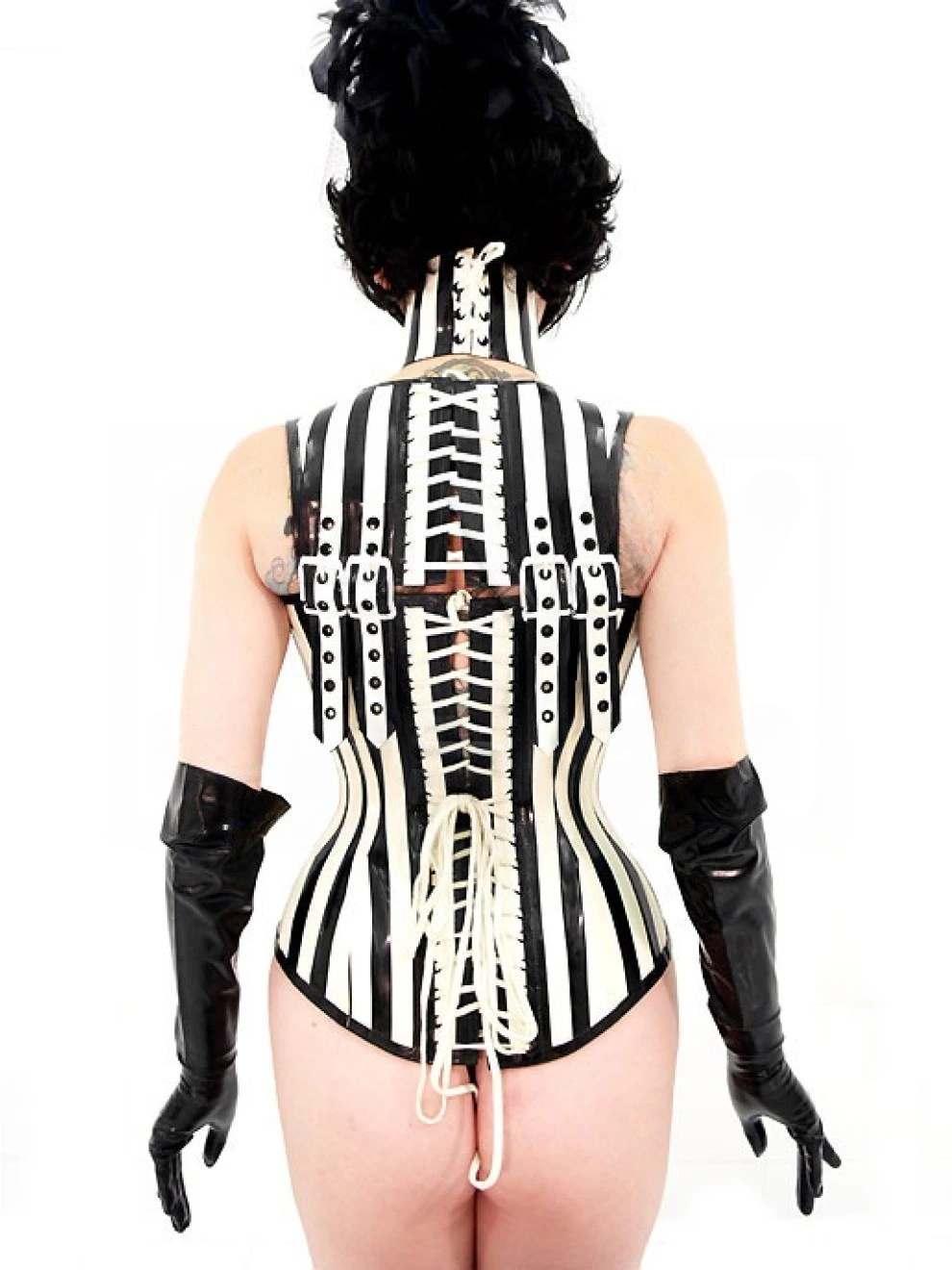 Adjust the shoulder part over the four buckles on the back – your body will be forced into an upright position and your shoulders backwards. In case that times ticking, the latex corset can be taken off quickly by the front zip.