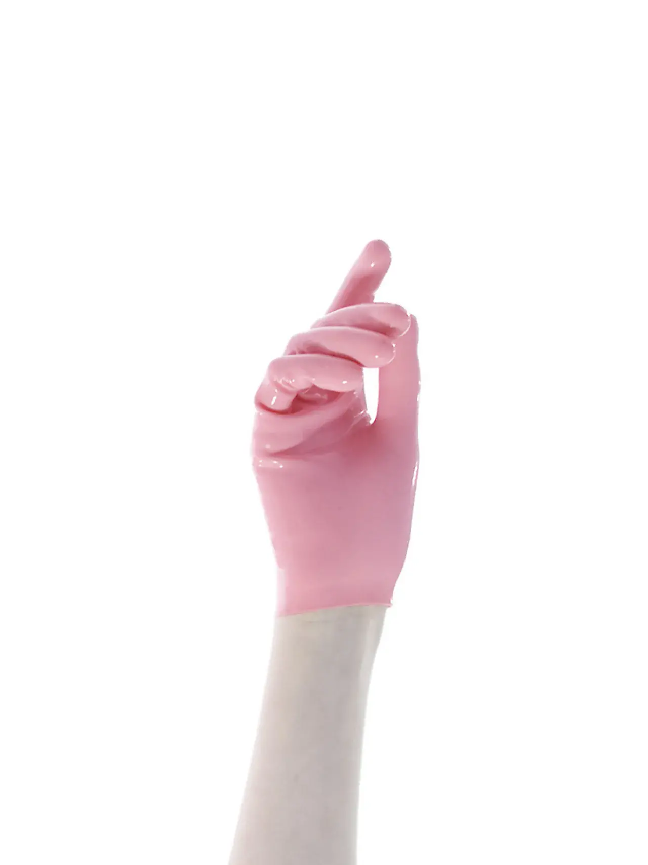 Cropped version latex gloves that elegantly reach the wrist. Sold as a pair.