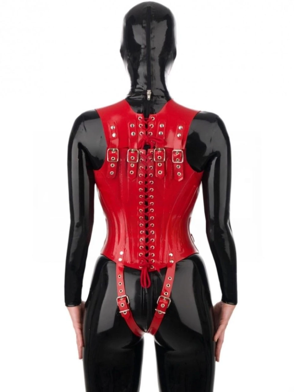 With our latex discipline corset your sub stands upright. It is based on the original punishment corset of the turn of the century and consists of two parts: On the one hand a waist cincher corset, on the other hand a shoulder part, which is firmly connected to the corset by the shoulder straps.