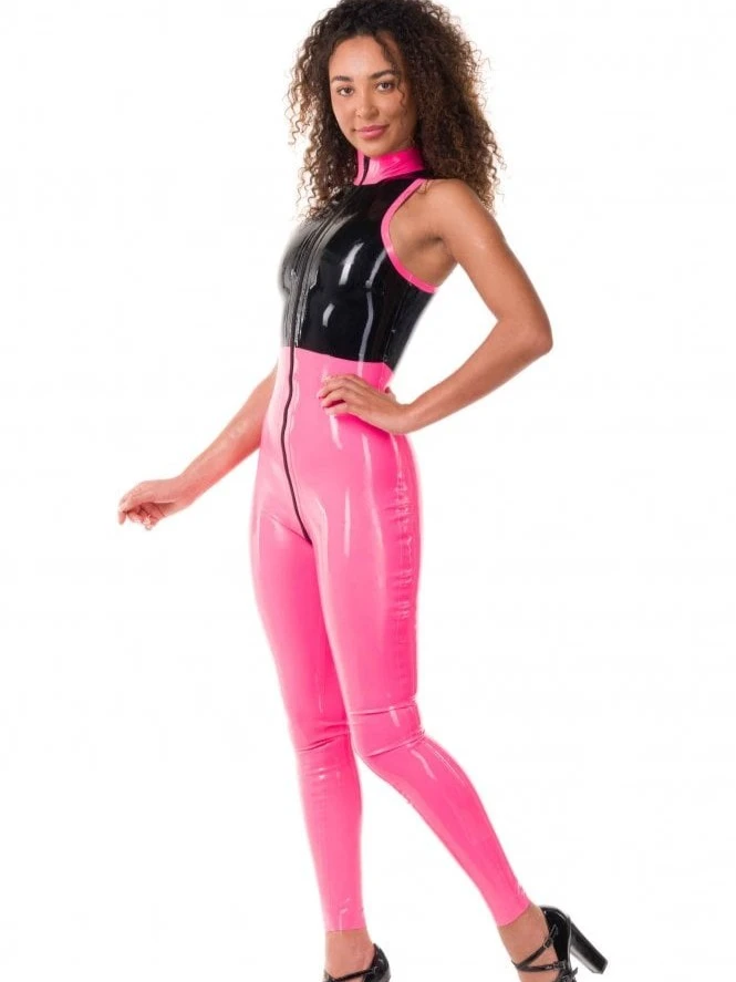 Gorgeous two-tone high neck latex catsuit with open sleeves and feet.
