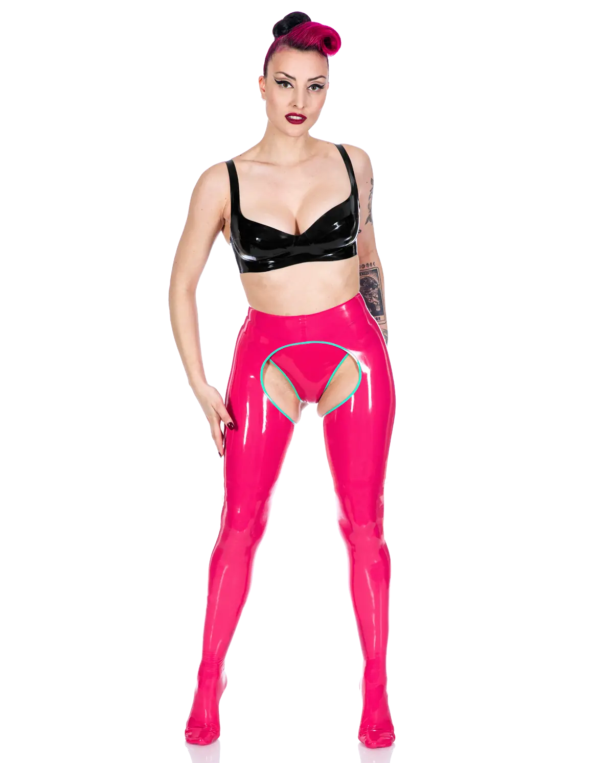 - The Belladonna tights feature an open crotch with optional trim and are made in a thinner, tighter rubber as standard.