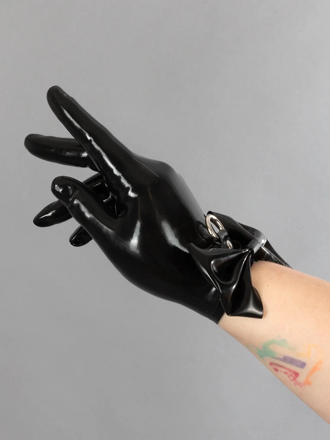 Black latex wrist gloves with bow accents and d-ring.