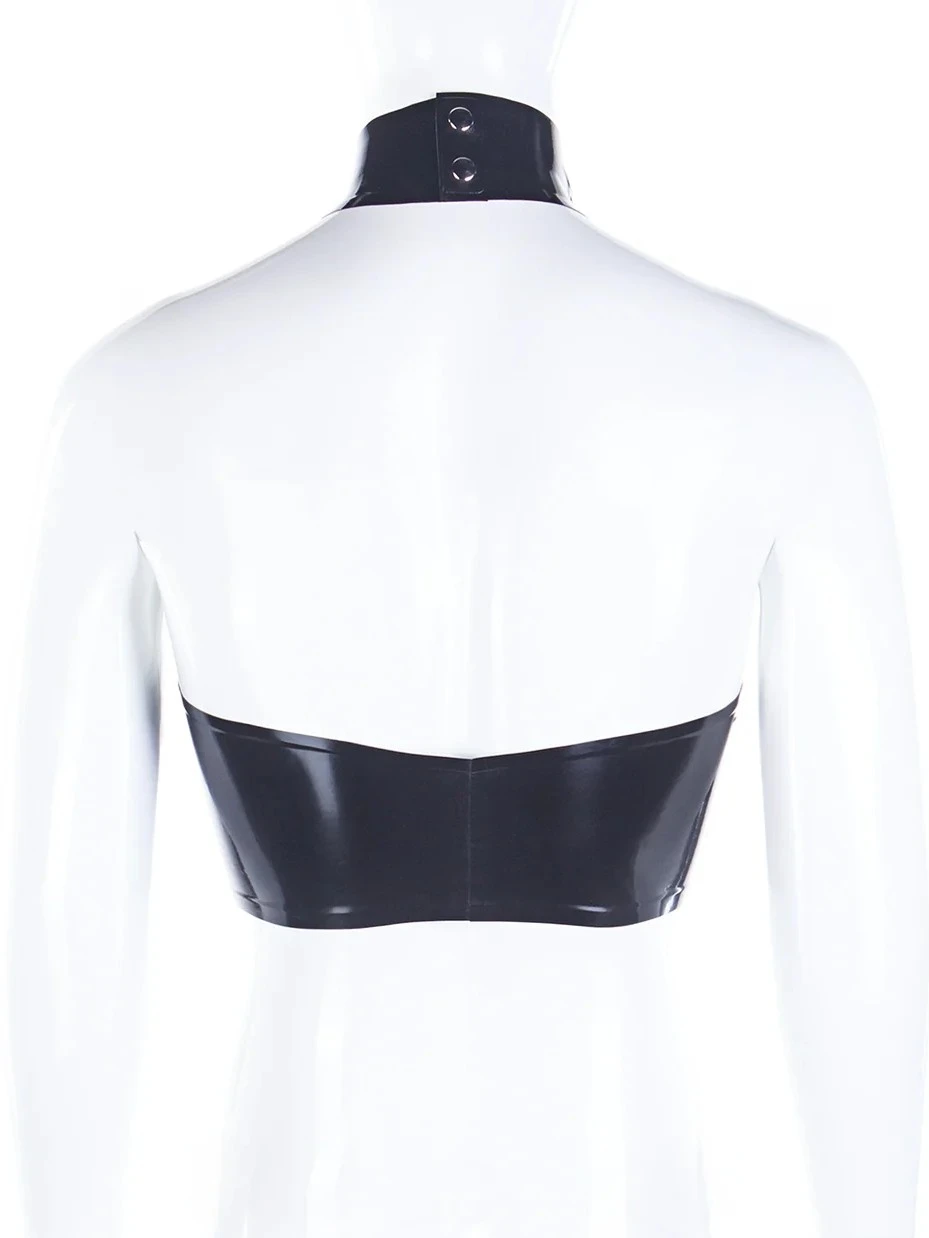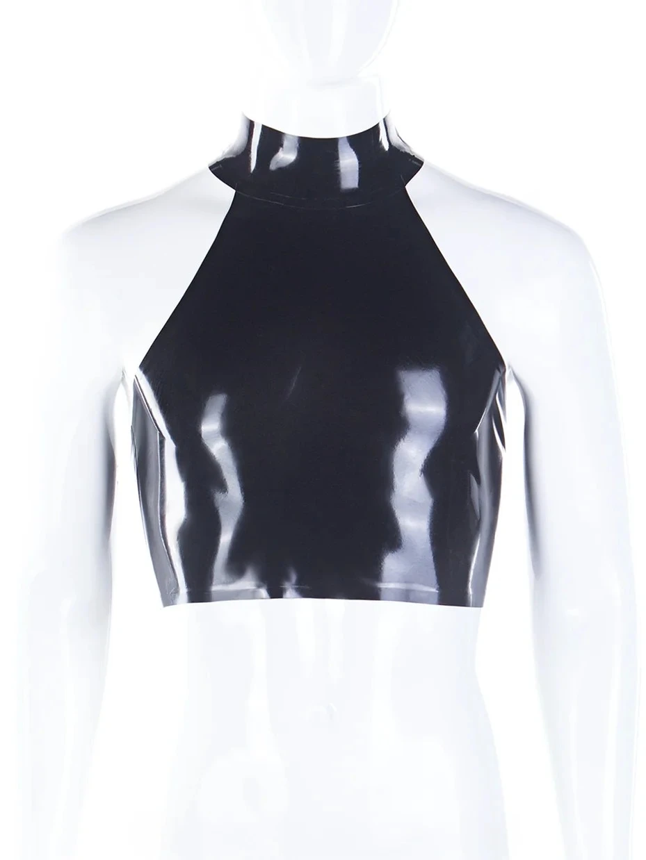 This is a sleek, black latex halter crop top with a high neckline and an open shoulder design.