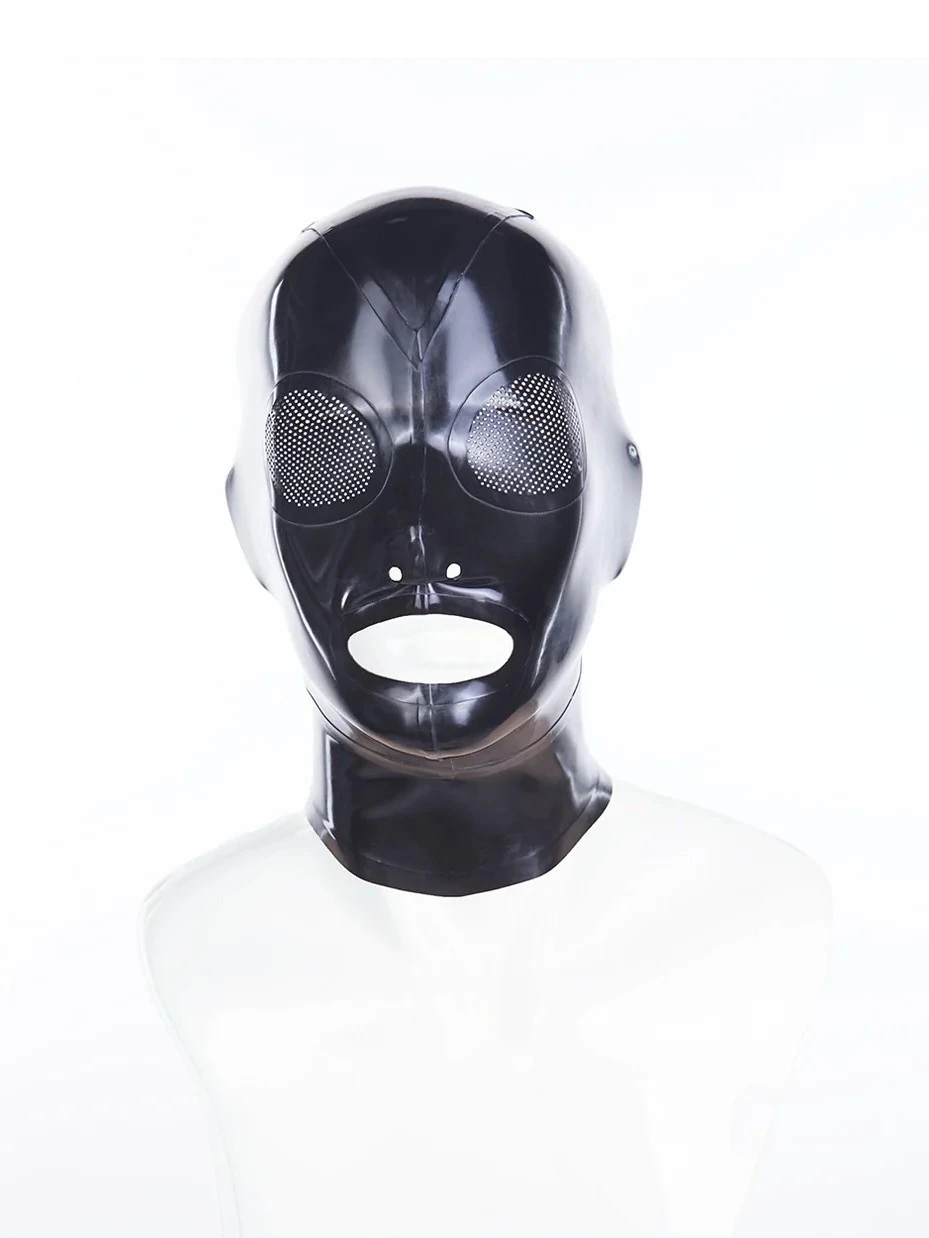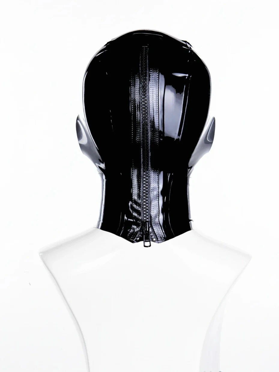 This latex hood plays with the contrast between exposure and concealment. The micro-perforated eyes blur the wearer??s gaze, creating a barrier that hides expression while still allowing vision.