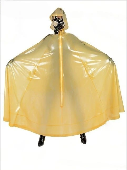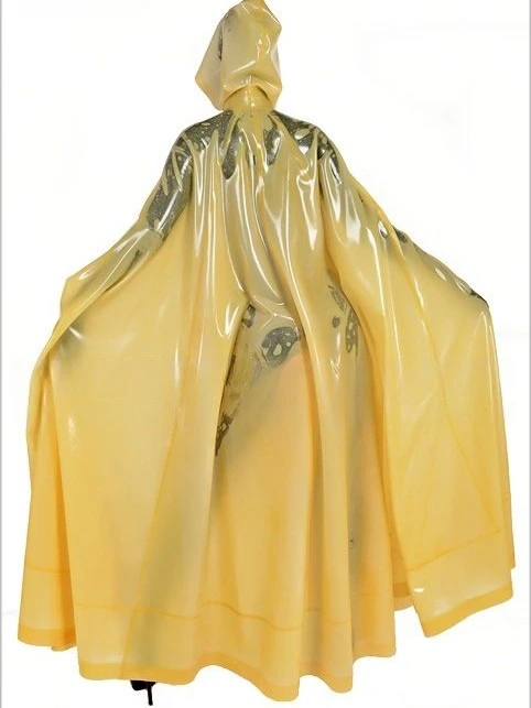 A full length flared rubber hooded cape with large loose fit hood, Long front zip and heavy duty buckle around the neck. The rubber cape has arm slits as it flows beautifully from the shoulder down, encasing you in heavy rubber.