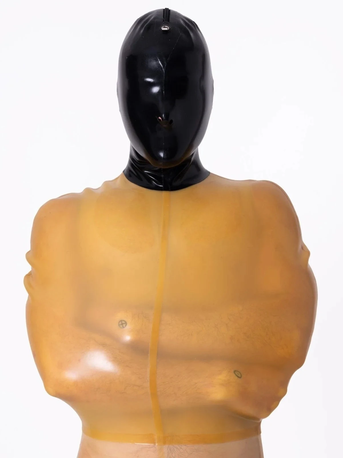 This suit combines a lighter weight neck entry sleeveless inner layer fused to a heavy weight hooded outer layer. After pulling on the inner suit, the outer layer is zipped up encasing the head and arms in their own latex chamber.