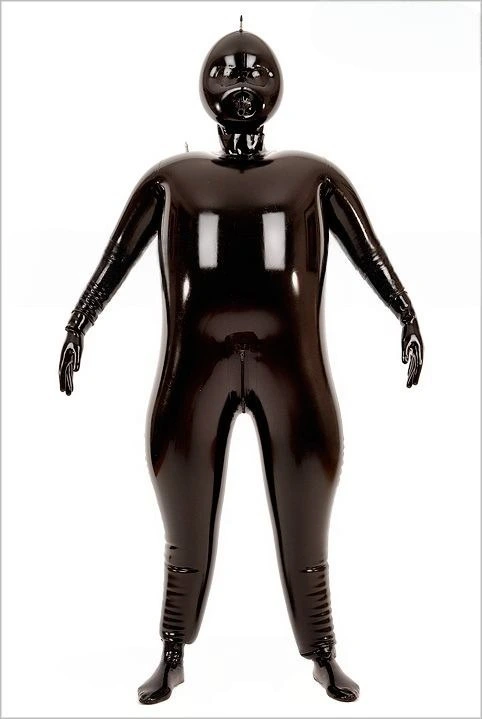 A Heavy Rubber Inflatable Catsuit with a high collar and external inflation valve on the shoulder.