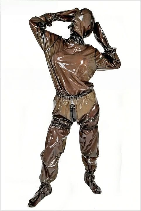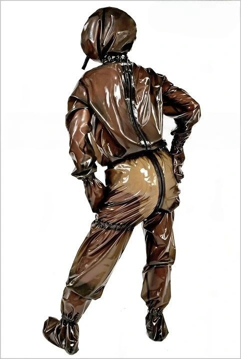 This is a loose fitting total enclosure rubber suit which is designed for long periods of wear and comfort. It has a 3 way through crotch back zip which runs up to the back of the hood.