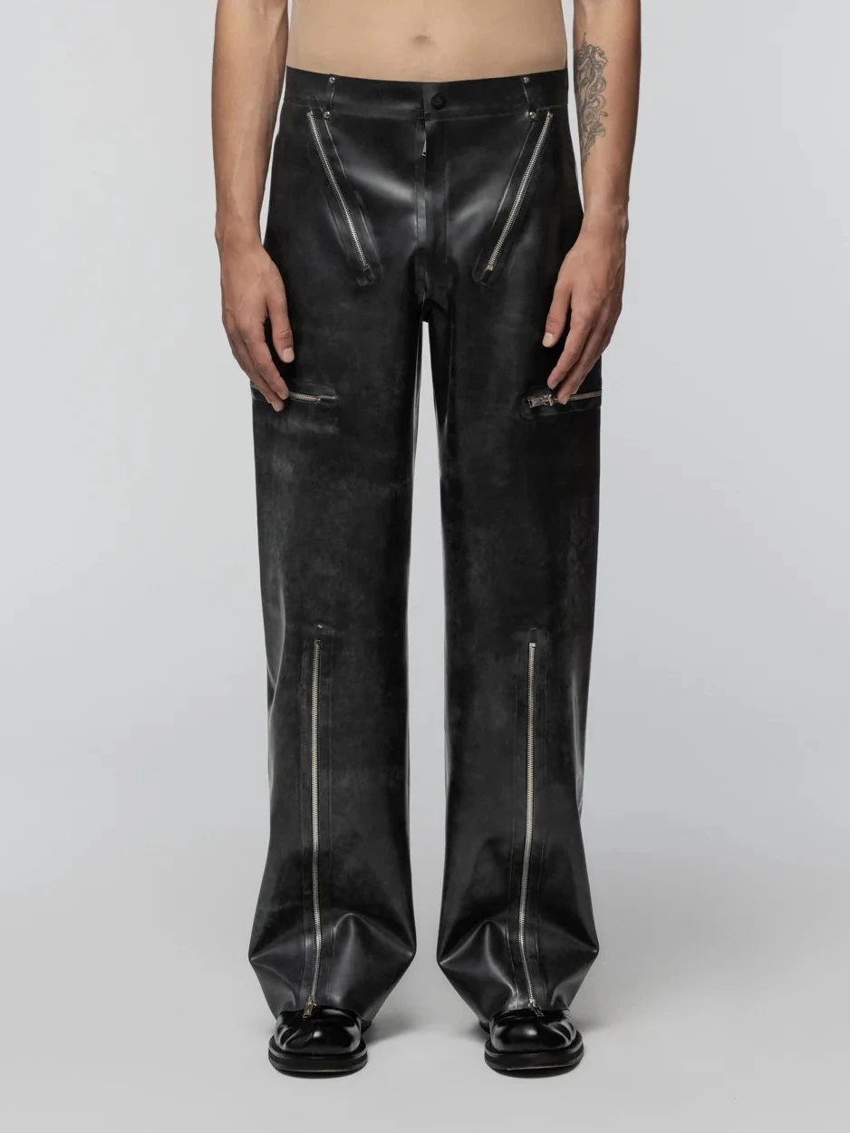 These low-waist loose pants are unisex and made of latex. Multiple functioning zippers highlight the gritty, cyberpunk vibes of the item and give more space for experimenting with the silhouette.