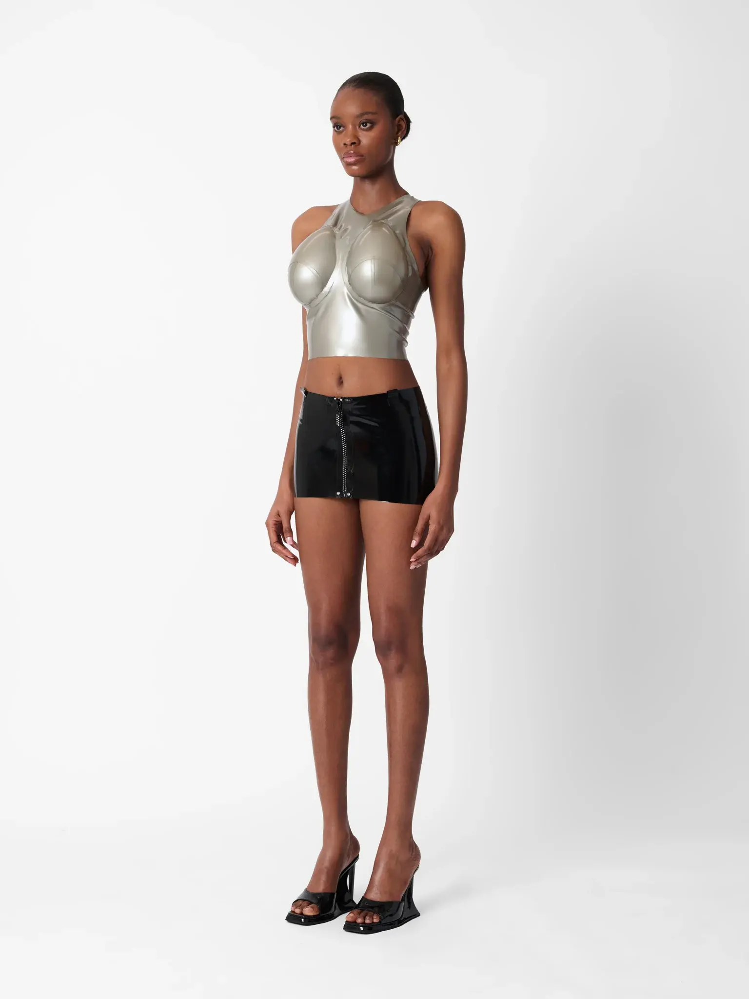 Introducing the Manhattan mini skirt. This low rise latex micro mini skirt is part of our new latex party collection, and features a rhinestone front center zip and two back pocket detailing.