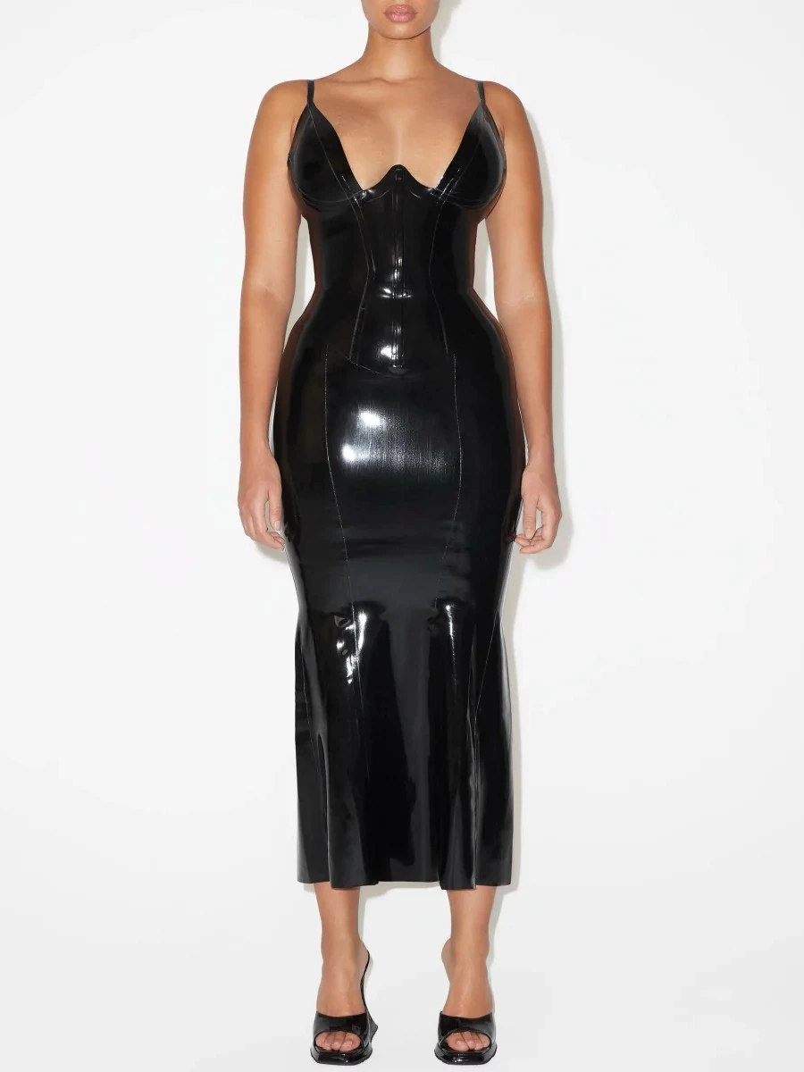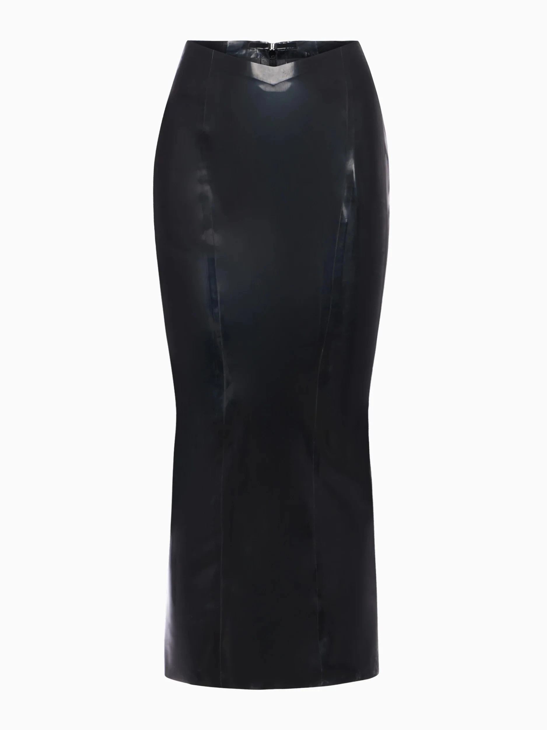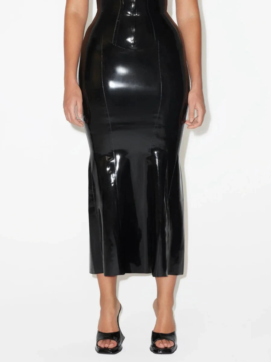 A maxi skirt featuring a zip closure at the back. Fabricated in ultra-high-gloss latex.