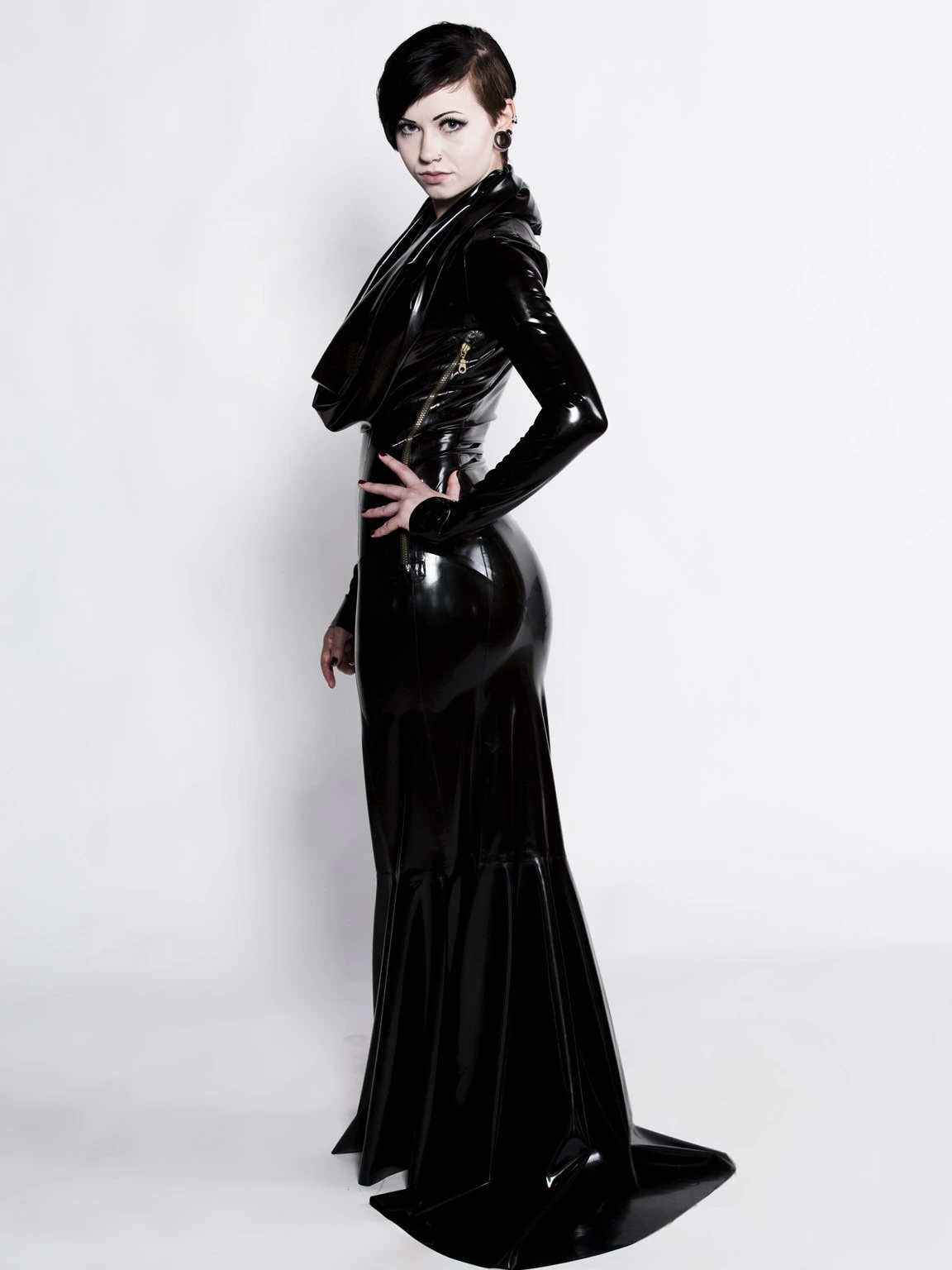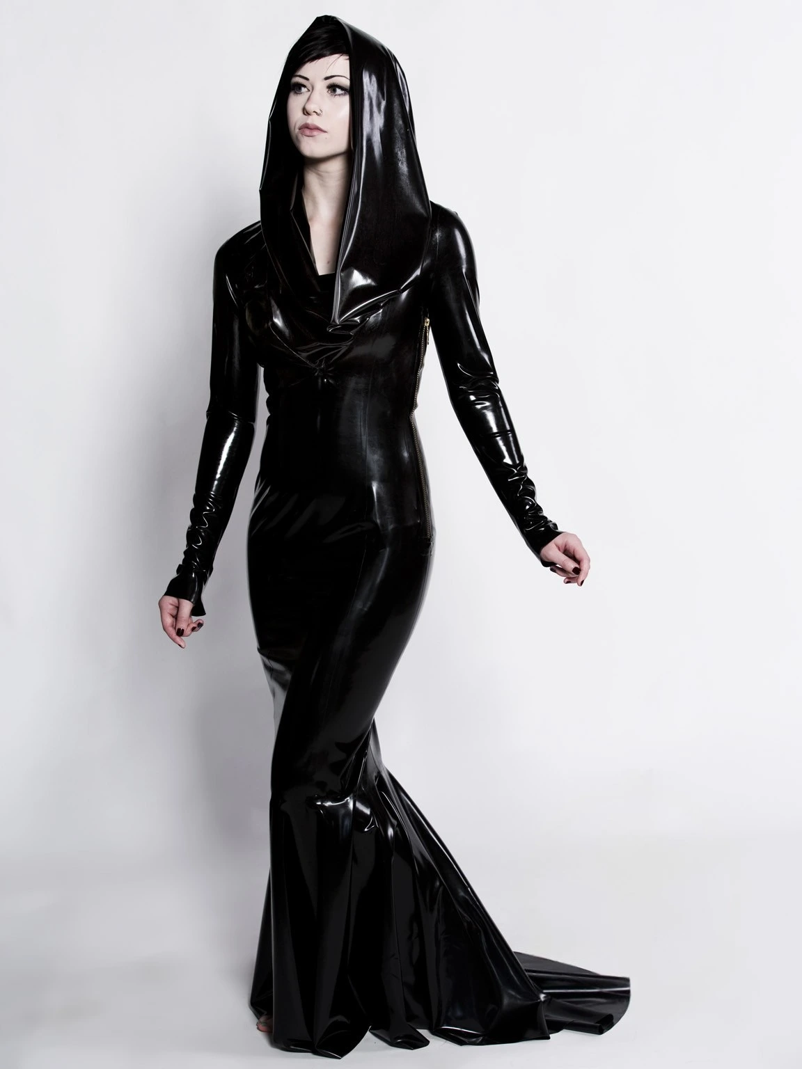 This full length latex gown quietly makes a loud statement. It has a latex lined hood that drapes into a deep cowl neck to crown that figure hugging silhouette.
