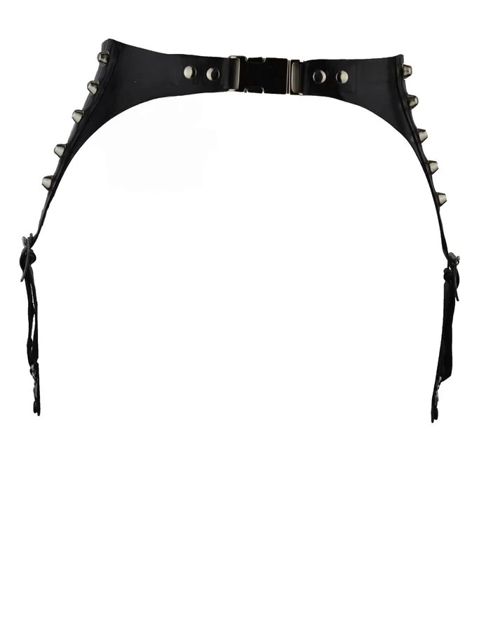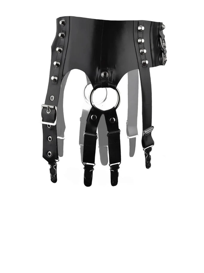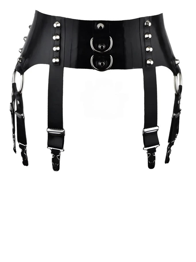 Latex 8 strap suspender belt with studs, rings and buckles. Fastens at the back with a chrome clip