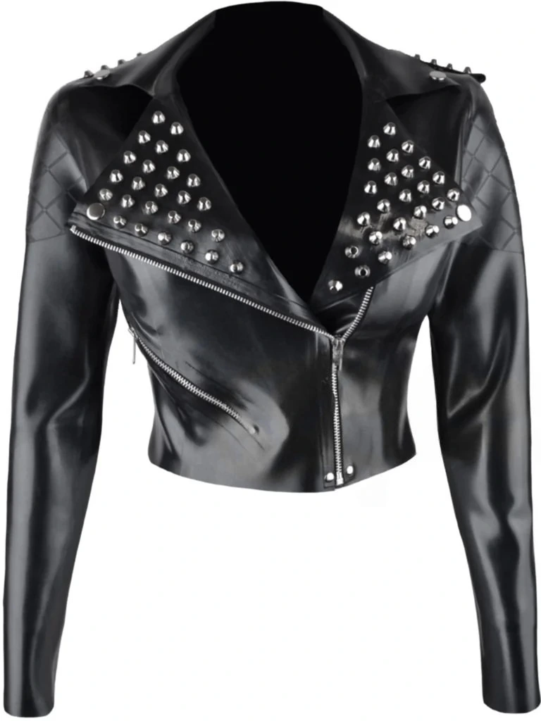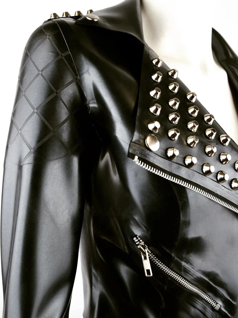 Latex biker jacket made from 0.4mm thick latex, with studded lapels and epaulettes. Laser-etched criss-cross detail at the top of the sleeves.