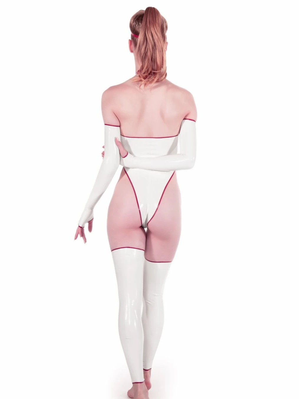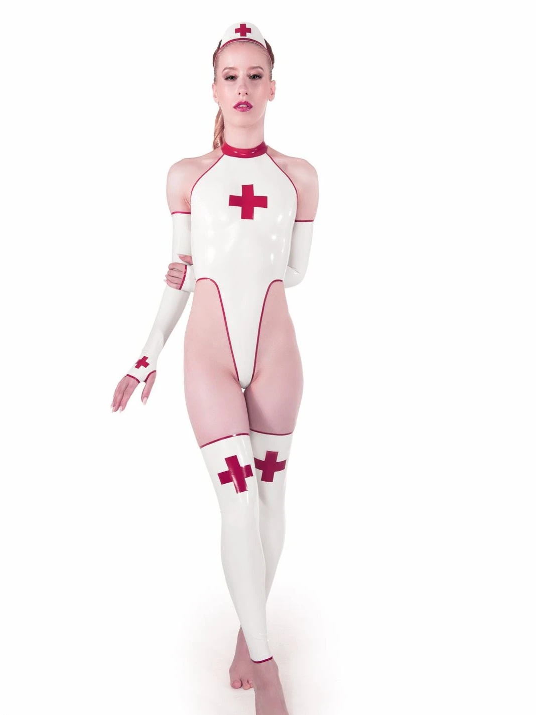 A complete uniform for a naughty nurse, consisting of a very high cut bodysuit, stockings, gloves and a cap. The bodysuit has a very attractive design – thanks to the high cuts it really shows a lot of leg. It??s decorated with contrast elements in red colour and is fastened behind the neck with a small hook.