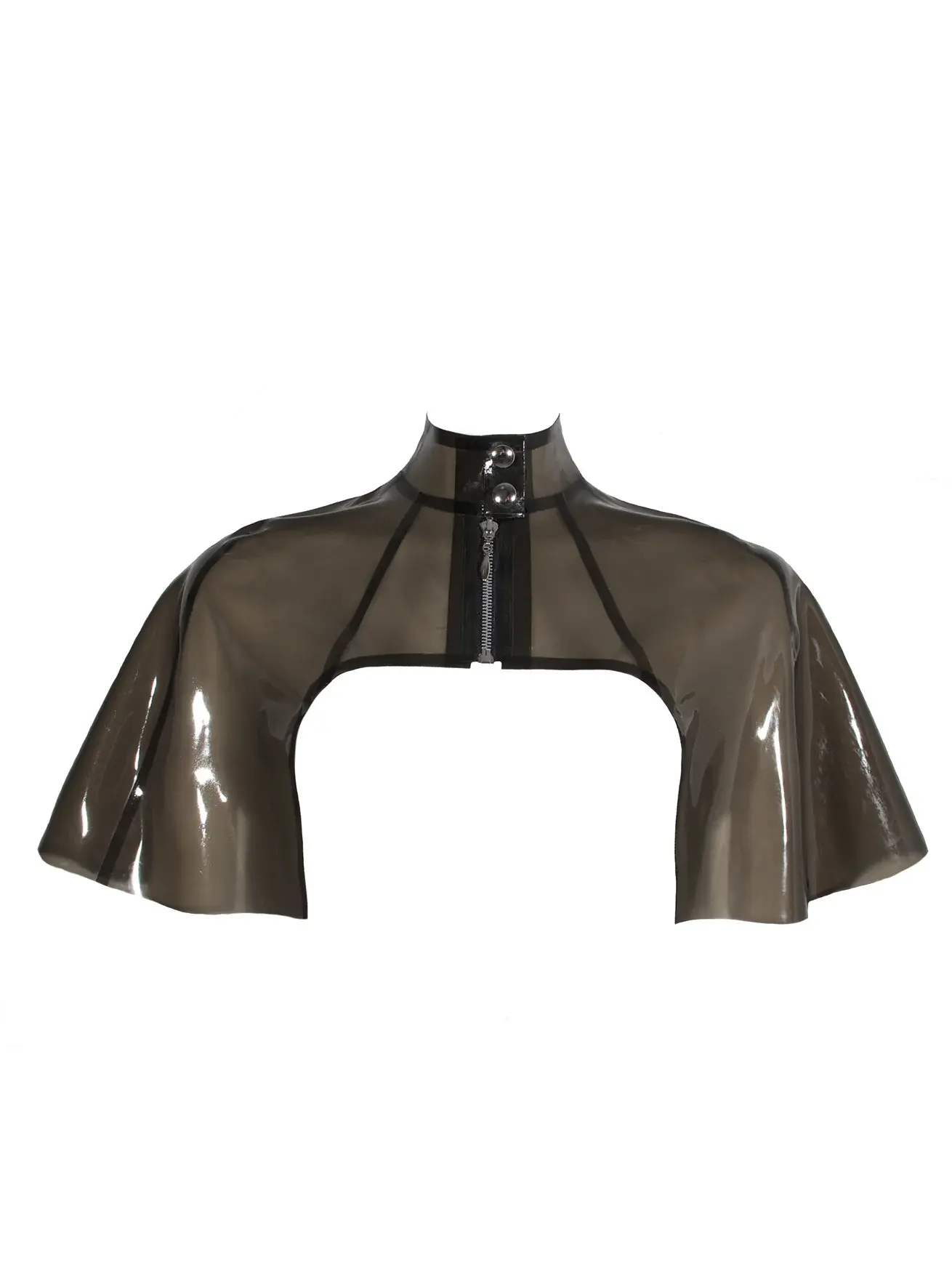 Experience the epitome of style and versatility with our High Collar Zip Front Latex Cape.