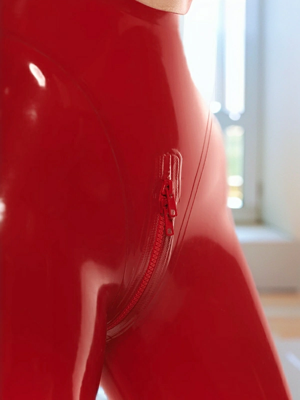 Stella Latex leggings have a high waist. They have decorative stitches that go from a panties zone and run down on the back of the legs. This detail visually lengthens them. Also, this item has a zipper with a lining between the legs.