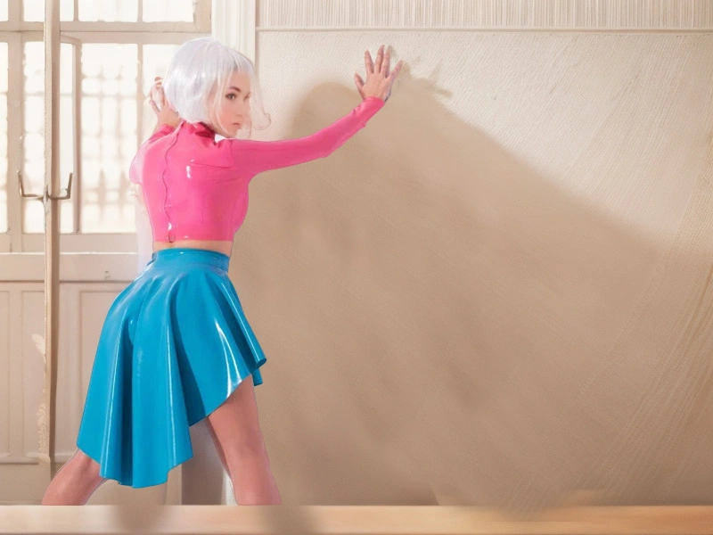 Asymmetric circle latex skirt sits up on the waist to perfectly hang in a flared shape around the hips and has a large side at the back. Pull on as standard. In the picture is shown in Light Blue.