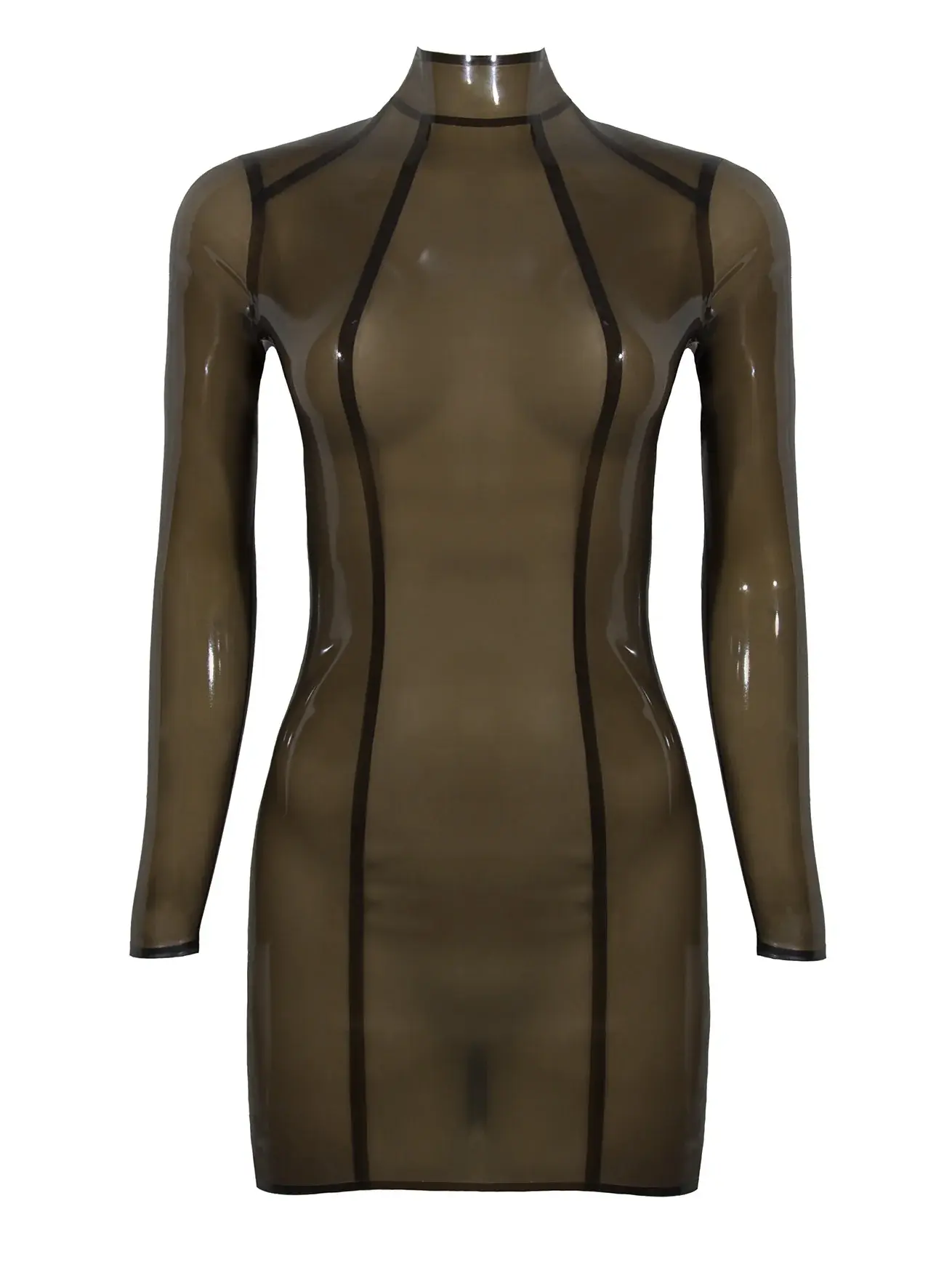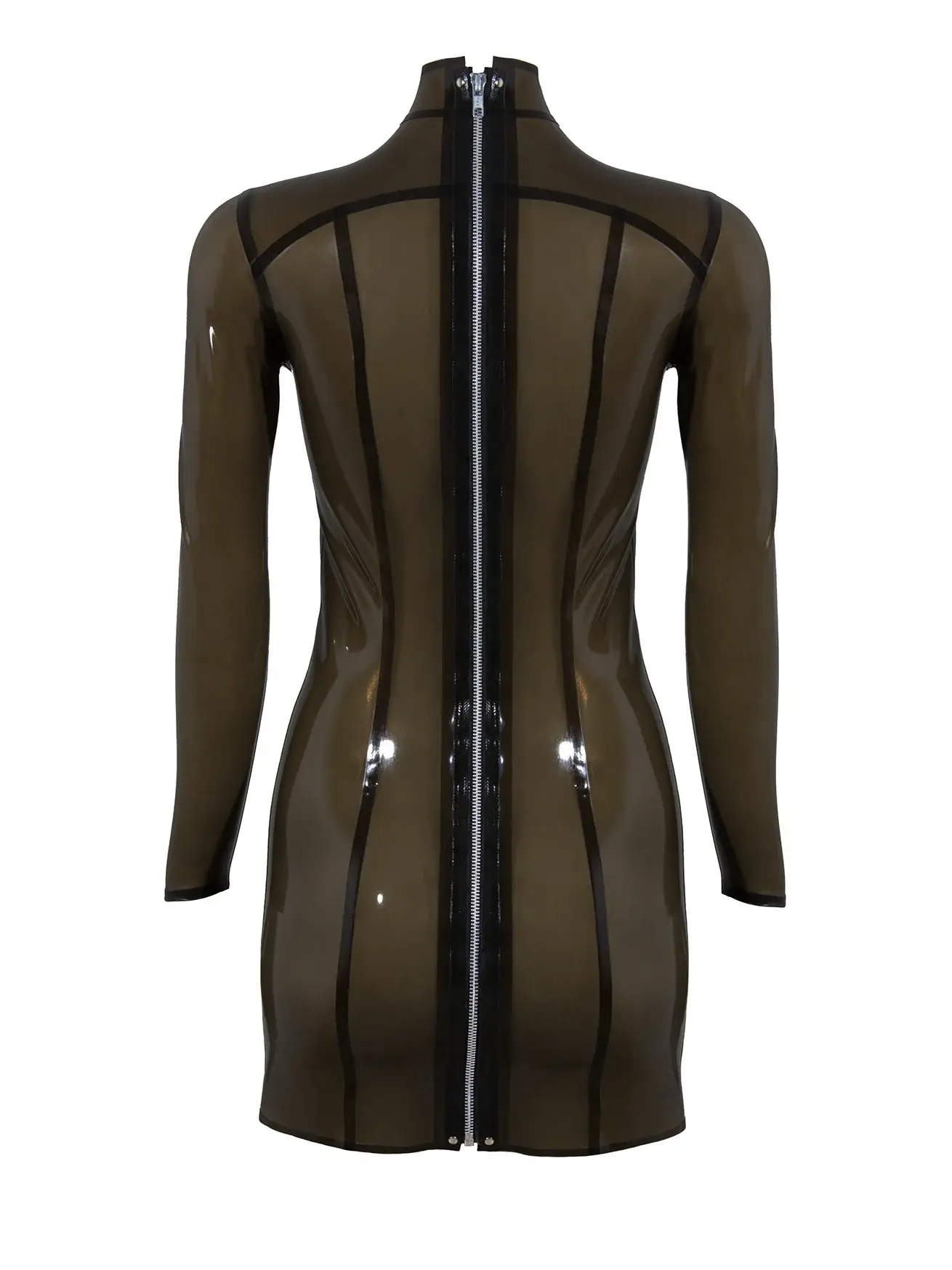 This fitted mini latex dress, featuring transparent elements, showcases front and back princess seams for an impeccable fit, faux raglan sleeve shaping, and a convenient back zipper opening.