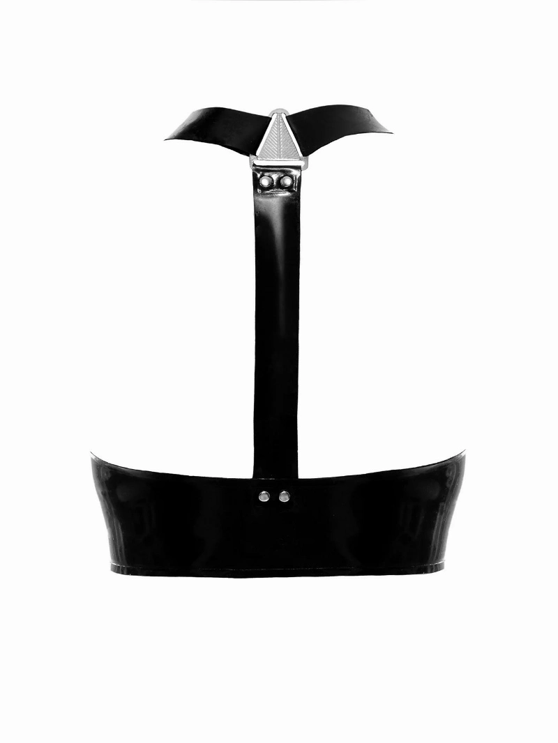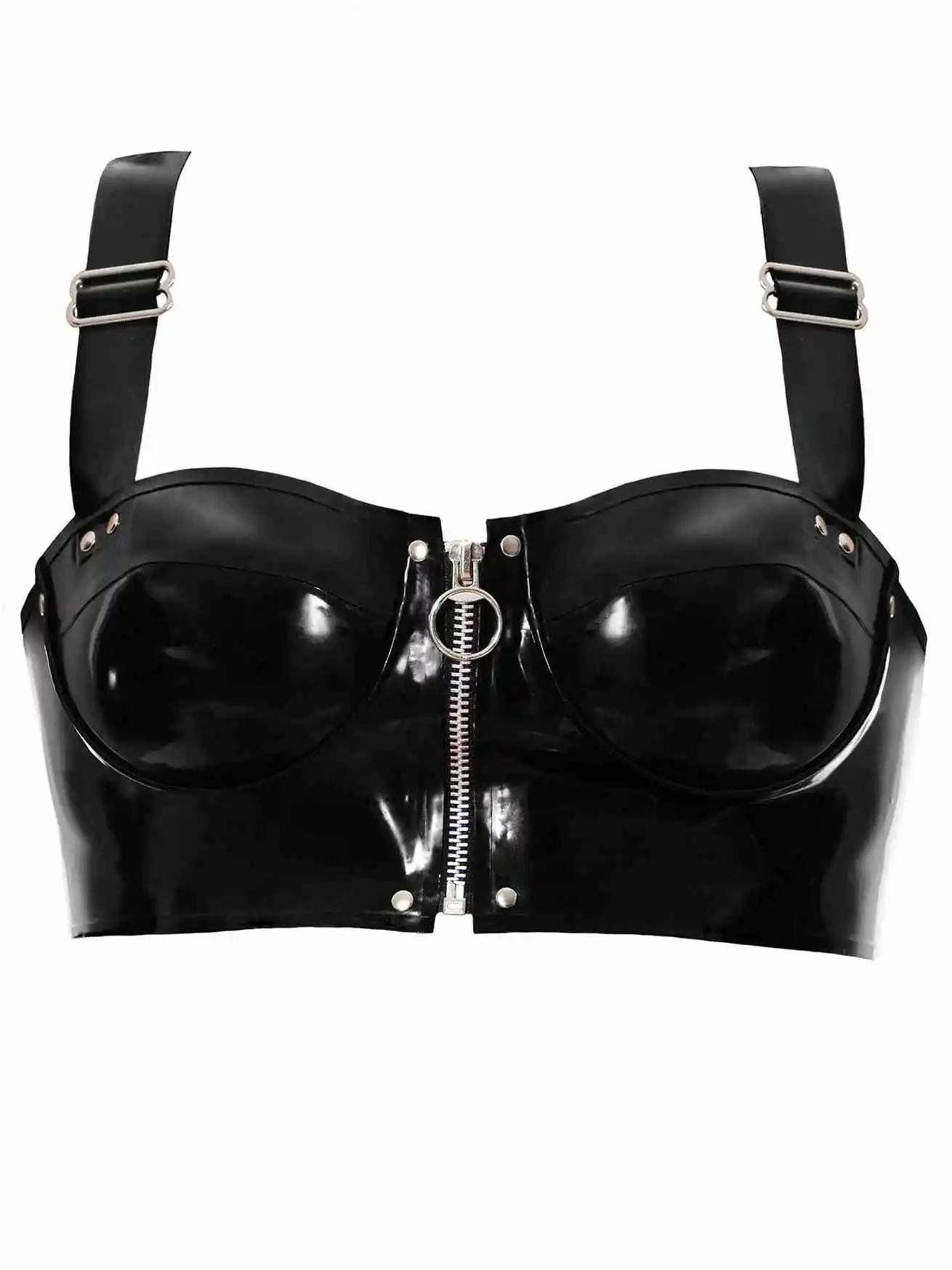 Part of our heavy rubber collection. This bra top features underwire cup detail, front O-ring zipper, wide adjustable straps and a T-Strap suspender back.